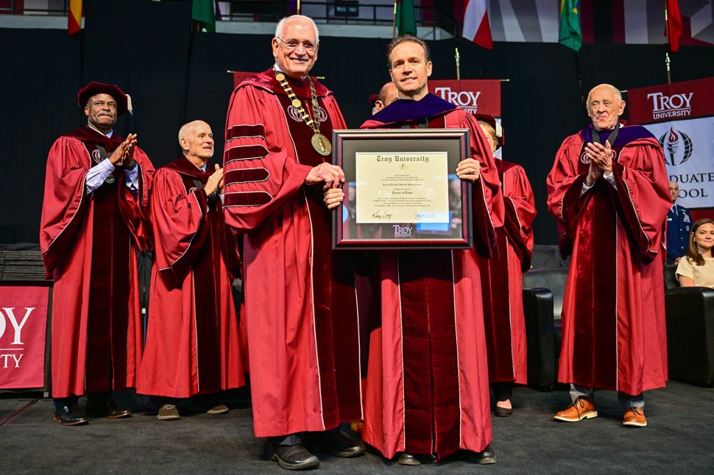 At the conclusion of the ceremony, Chancellor Jack Hawkins, Jr. and members of the Troy University Board of Trustees conferred on Alverde the honorary Doctor of Laws degree.