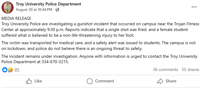 The incident just before 9:30 p.m. directly in front of the Trojan Wellness and Fitness Center, just off George Wallace Drive, shortly after Troy’s season-opening football win over Nicholls State on campus.